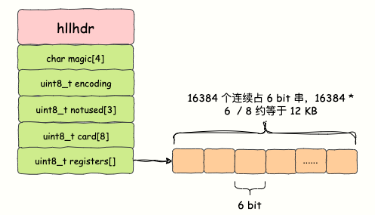 5、egisters[]:这个字段是一个可变长度的字节数组,用来存储 HyperLogLog 的数据。