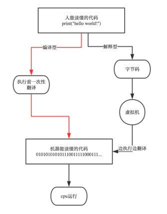 解释型:跨平台好,一份代码,到处使用;缺点:执行速度慢,依赖解释器运行