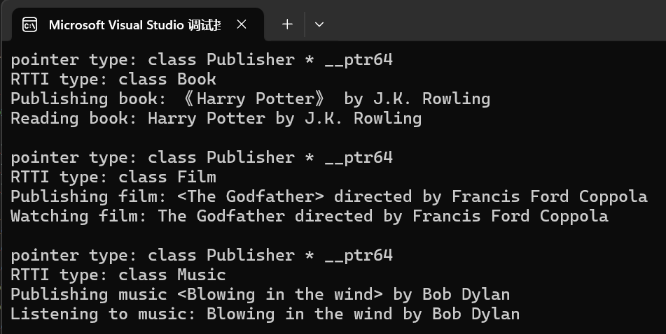 1 #include "publisher.hpp" 2 #include <vector> 3 #include <typeinfo> 4 5 using std::vector; 6 7 void test() { 8 vector<Publisher *> v; 9 10 v.push_back(new Book("Harry Potter", "J.K. Rowling")); 11 v.push_back(new Film("The Godfather", "Francis Ford Coppola")); 12 v.push_back(new Music("Blowing in the wind", "Bob Dylan")); 13 14 for(auto &ptr: v) { 15 cout << "pointer type: " << typeid(ptr).name() << endl; // 输出指针类型 16 cout << "RTTI type: " << typeid(*ptr).name() << endl; // 输出指针指向的对象类型 17 ptr->publish(); 18 ptr->use(); 19 cout << endl; 20 } 21 } 22 23 int main() { 24 test(); 25 }