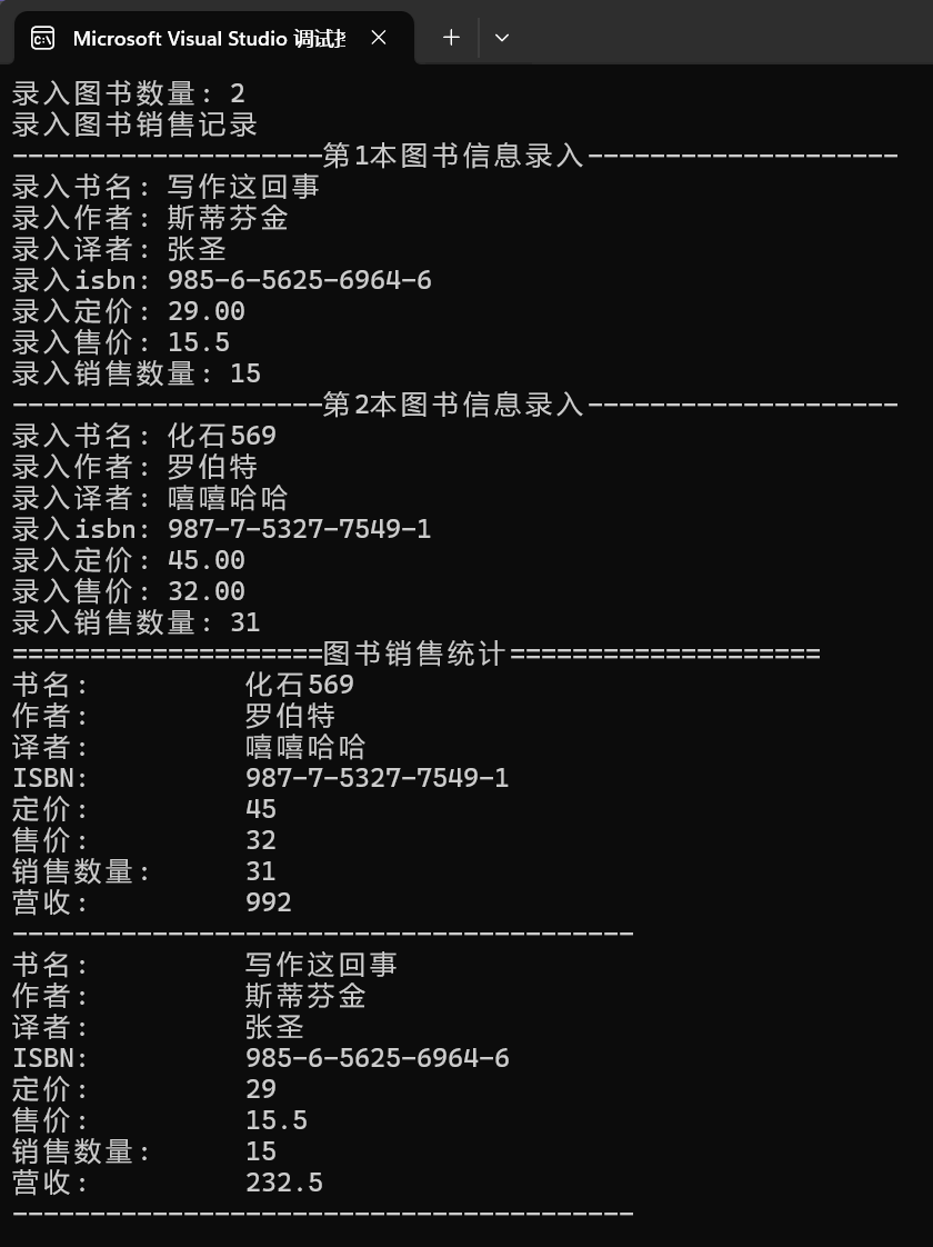 1 #include "booksale.hpp" 2 #include <iostream> 3 #include <string> 4 #include <vector> 5 #include <algorithm> 6 7 // 按图书销售数额比较 8 bool compare_by_amount(const BookSale &x1, const BookSale &x2) { 9 return x1.get_amount() > x2.get_amount(); 10 } 11 12 void test() { 13 using namespace std; 14 15 vector<BookSale> sales_lst; // 存放图书销售记录 16 17 int books_number; 18 cout << "录入图书数量: "; 19 cin >> books_number; 20 21 cout << "录入图书销售记录" << endl; 22 for(int i = 0; i < books_number; ++i) { 23 string name, author, translator, isbn; 24 float price; 25 cout << string(20, '-') << "第" << i+1 << "本图书信息录入" << string(20, '-') << endl; 26 cout << "录入书名: "; cin >> name; 27 cout << "录入作者: "; cin >> author; 28 cout << "录入译者: "; cin >> translator; 29 cout << "录入isbn: "; cin >> isbn; 30 cout << "录入定价: "; cin >> price; 31 32 Book book(name, author, translator, isbn, price); 33 34 float sales_price; 35 int sales_amount; 36 37 cout << "录入售价: "; cin >> sales_price; 38 cout << "录入销售数量: "; cin >> sales_amount; 39 40 BookSale record(book, sales_price, sales_amount); 41 sales_lst.push_back(record); 42 } 43 44 // 按销售册数排序 45 sort(sales_lst.begin(), sales_lst.end(), compare_by_amount); 46 47 // 按销售册数降序输出图书销售信息 48 cout << string(20, '=') << "图书销售统计" << string(20, '=') << endl; 49 for(auto &t: sales_lst) { 50 cout << t << endl; 51 cout << string(40, '-') << endl; 52 } 53 } 54 55 int main() { 56 test(); 57 }