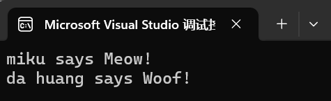 1 #include <iostream> 2 #include <vector> 3 #include "pets.hpp" 4 5 void test() { 6 using namespace std; 7 8 vector<MachinePets *> pets; 9 10 pets.push_back(new PetCats("miku")); 11 pets.push_back(new PetDogs("da huang")); 12 13 for(auto &ptr: pets) 14 cout <<ptr->get_nickname() << " says " << ptr->talk() << endl; 15 } 16 17 int main() { 18 test(); 19 }