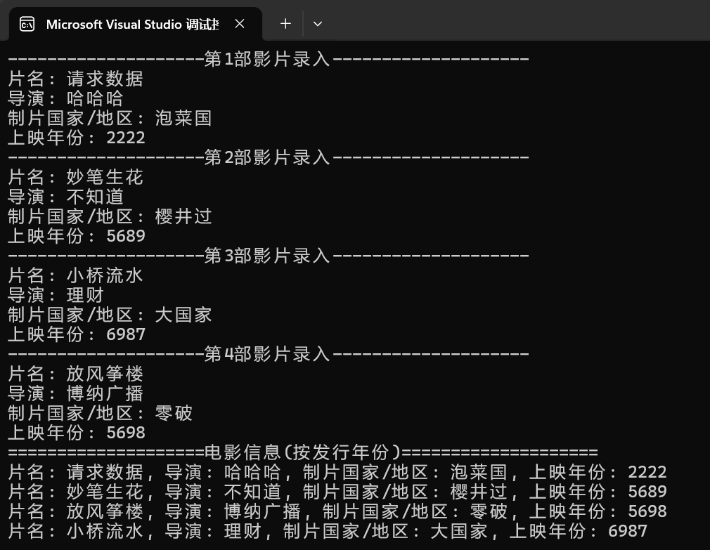 1 #include "film.hpp" 2 #include <iostream> 3 #include <string> 4 #include <vector> 5 #include <algorithm> 6 7 void test() { 8 using namespace std; 9 10 int n; 11 cout << "输入电影数目: "; 12 cin >> n; 13 14 cout << "录入" << n << "部影片信息" << endl; 15 vector<Film> film_lst; 16 for (int i = 0; i < n; ++i) { 17 Film f; 18 cout << string(20, '-') << "第" << i + 1 << "部影片录入" << string(20, '-') << endl; 19 cin >> f; 20 film_lst.push_back(f); 21 } 22 23 // 按发行年份升序排序 24 sort(film_lst.begin(), film_lst.end(), compare_by_year); 25 26 cout << string(20, '=') + "电影信息(按发行年份)" + string(20, '=') << endl; 27 for (auto& f : film_lst) 28 cout << f << endl; 29 } 30 31 int main() { 32 test(); 33 }