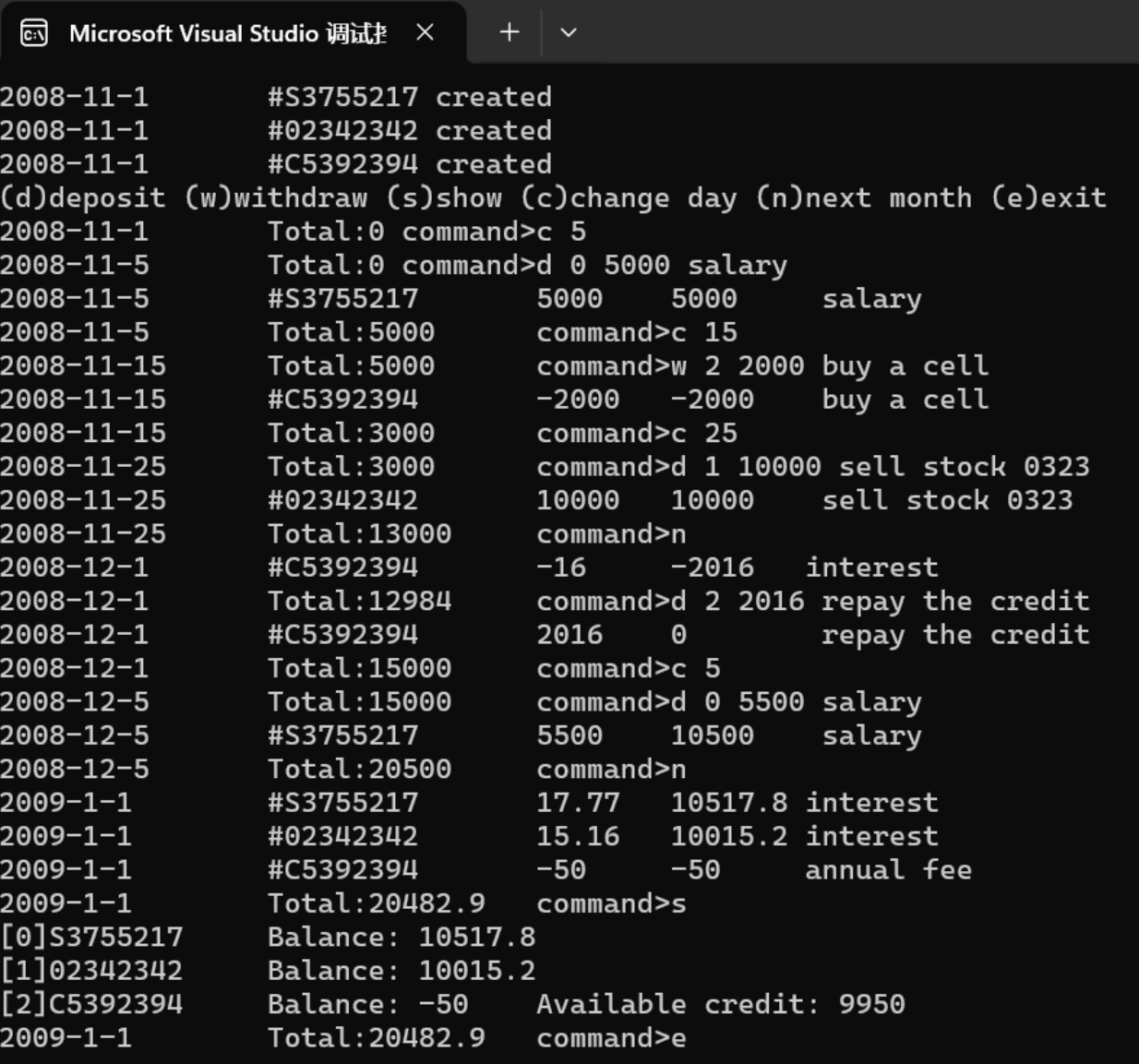 1 #include "account.h" 2 #include<iostream> 3 using namespace std; 4 5 int main() { 6 Date date(2008, 11, 1); 7 SavingsAccount sa1(date, "S3755217", 0.015); 8 SavingsAccount sa2(date, "02342342", 0.015); 9 CreditAccount ca(date, "C5392394", 10000, 0.0005, 50); 10 Account* accounts[] = { &sa1, &sa2, &ca }; 11 const int n = sizeof(accounts) / sizeof(Account*); 12 cout << "(d)deposit (w)withdraw (s)show (c)change day (n)next month (e)exit" << endl; 13 char cmd; 14 do { 15 date.show(); 16 cout << "\tTotal:" << Account::getTotal() << "\tcommand>"; 17 int index, day; 18 double amount; 19 string desc; 20 cin >> cmd; 21 switch (cmd) { 22 case 'd': 23 cin >> index >> amount; 24 getline(cin, desc); 25 accounts[index]->deposit(date, amount, desc); 26 break; 27 case 'w': 28 cin >> index >> amount; 29 getline(cin, desc); 30 accounts[index]->withdraw(date, amount, desc); 31 break; 32 case 's': 33 for (int i = 0; i < n; i++) { 34 cout << "[" << i << "]"; 35 accounts[i]->show(); 36 cout << endl; 37 38 } 39 break; 40 case 'c': 41 cin >> day; 42 if (day < date.getDay()) { 43 cout << "You cannot specify a previous day"; 44 45 } 46 else if (day > date.getMaxDay()) 47 cout << "Invalid day"; 48 else date = Date(date.getYear(), date.getMonth(), day); 49 break; 50 case 'n': 51 if (date.getMonth() == 12) 52 date = Date(date.getYear() + 1, 1, 1); 53 else 54 { 55 date = Date(date.getYear(), date.getMonth() + 1, 1); 56 } 57 for (int i = 0; i < n; i++) { 58 accounts[i]->settle(date); 59 60 } 61 break; 62 63 } 64 65 } while (cmd != 'e'); 66 return 0; 67 68 }