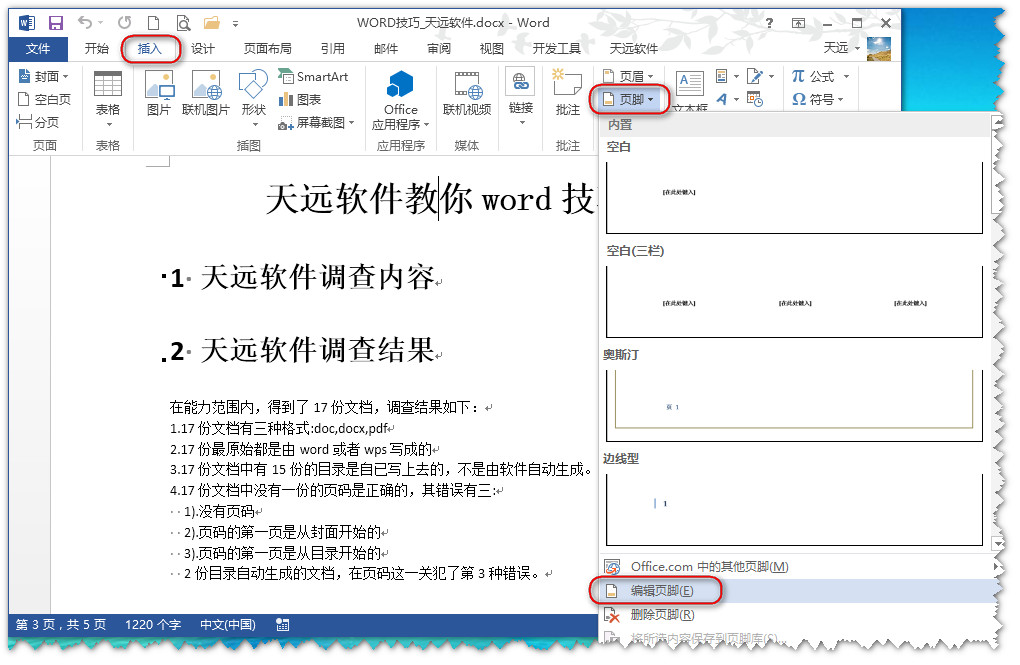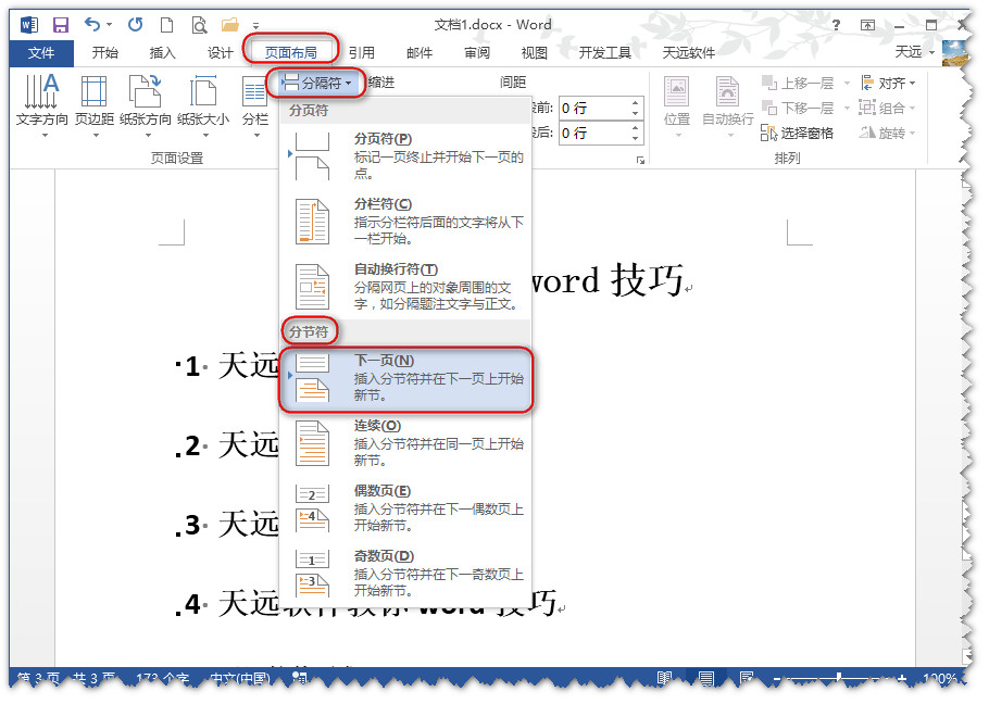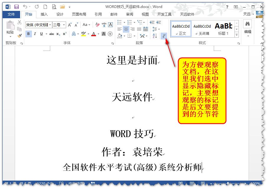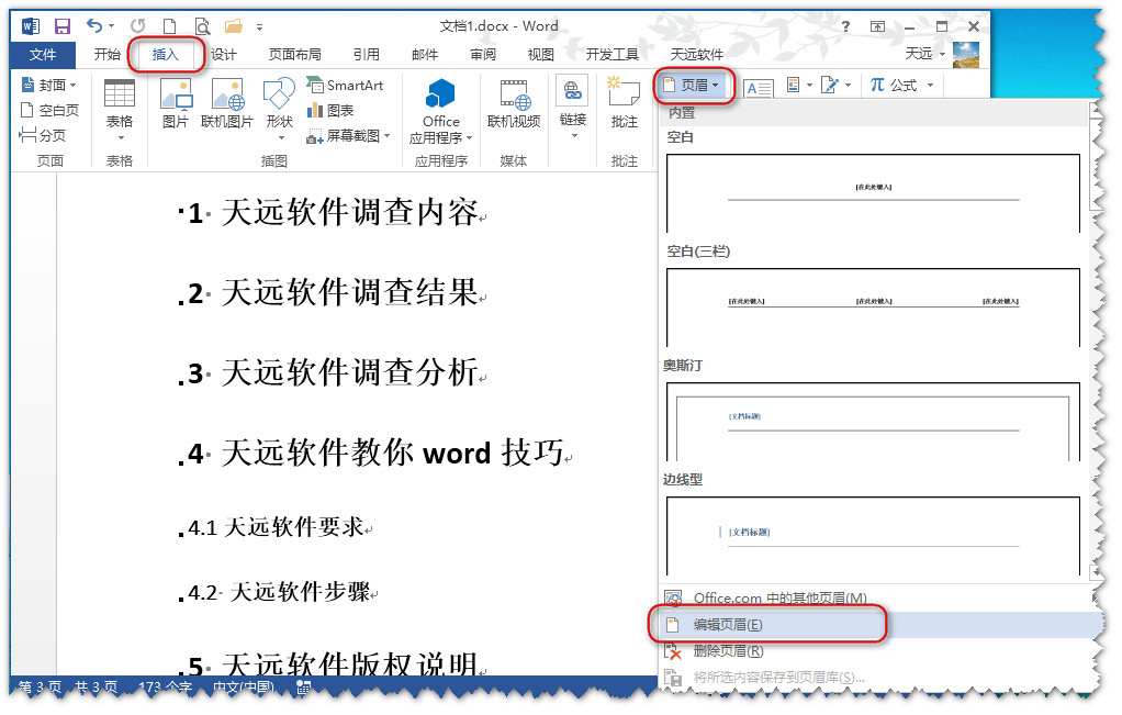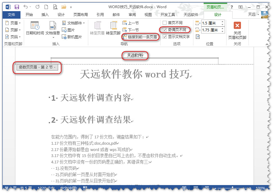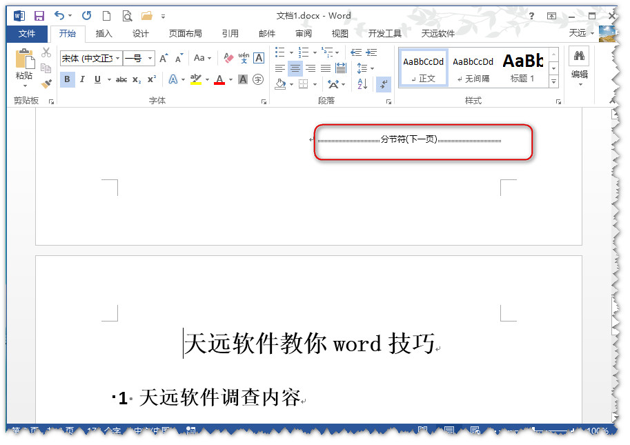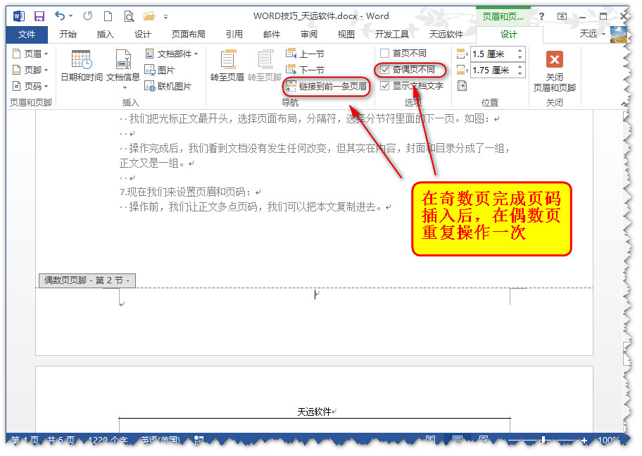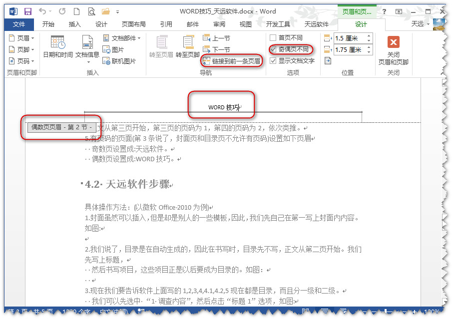 我们在正文第一页页眉写上"天远软件",第二页页眉写上"WORD技巧"