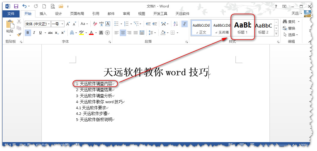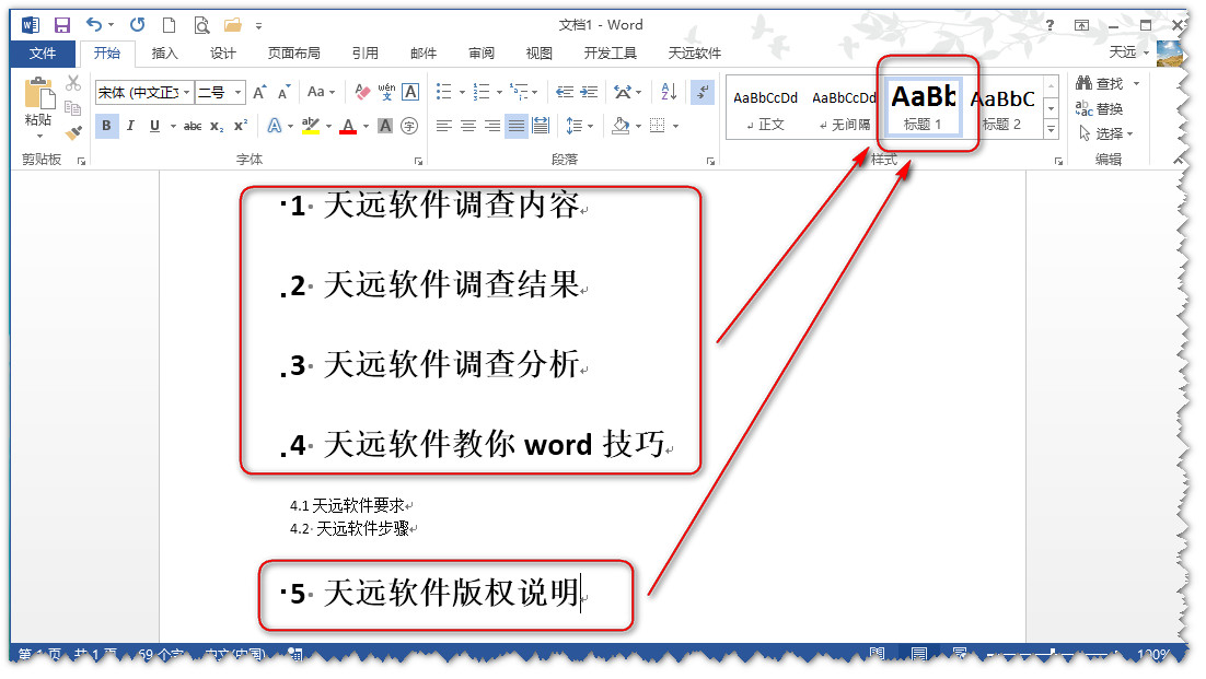 我们可以先选中 “1 调查内容”,然后点击“标题1”选项, 同样的方法完成2-5项,如图:
