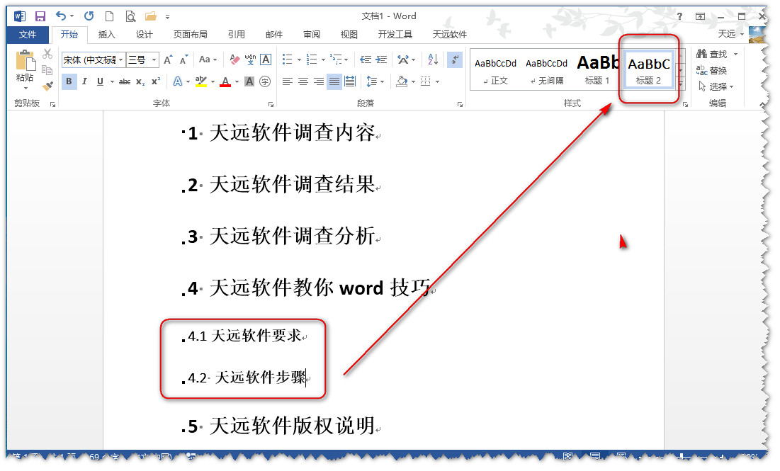 现在处理4.1和4.2,选中"4.1要求",然后点击"标题2"选项,同样地对4.2也如此操作。如图: