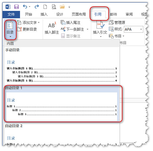 然后,选择引用标签下的目录,选择自动目录1即可,目录就自动产生了。如图: