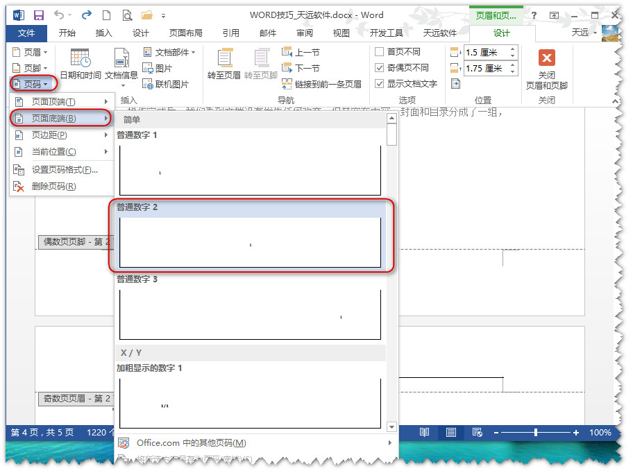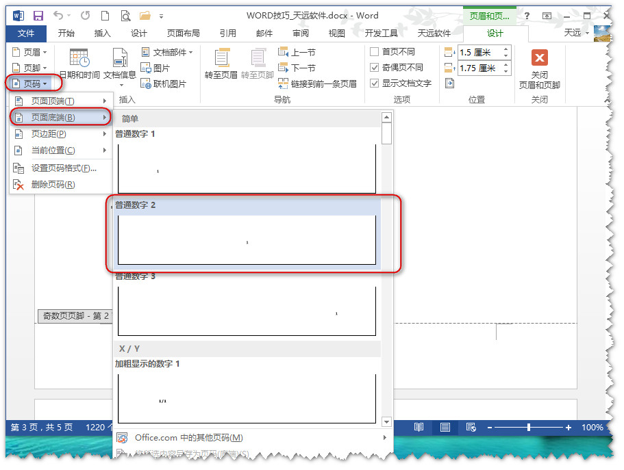 最后在页脚处选择页码,选择随便一种格式,这里我们选择页面底端并居中,