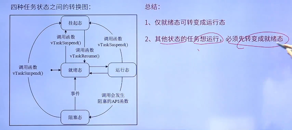 - 被抢占的任务将会进入就绪态