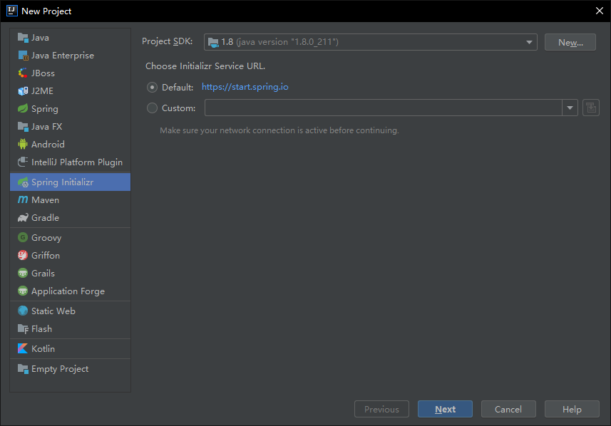 1、File->new->Project 选择左侧Spring Initializr (注意JDK版本是用1.8及以上)