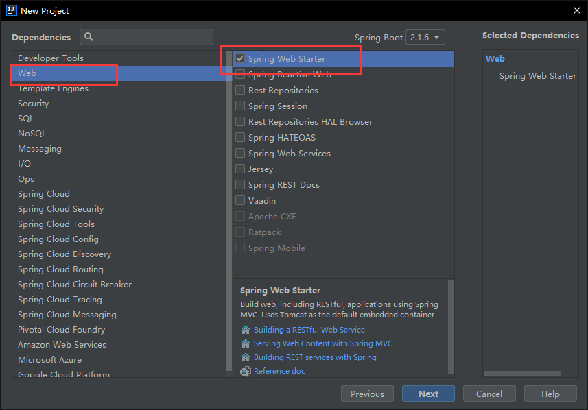 3、next 选择左侧web标签 勾选Spring Web Starter