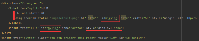 # 创建一个static文件夹,该文件夹下创建一个img文件夹,在该文件夹下存放一张默认的头像图片 --static --img default.png # 添加代码 {% load static %} <img src="{% static 'img/default.png' %}" alt="" id='myimg' width="50px" style="margin-left: 10px">