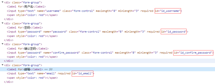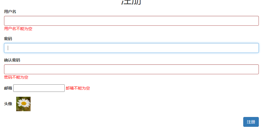 <body> <div class="container-fluid"> <div class="row"> <div class="col-xs-8 col-xs-offset-2"> <form id="myform"> {% csrf_token %} <h1 class="text-center">注册</h1> {% for form in form_obj %} <div class="form-group"> <label for="">{{ form.label }}</label> {{ form }} <!--form_obj是forms组件渲染的html页面--> <span>{{ form.errors.0 }}</span> </div> {% endfor %} <div class="form-group"> <label for="">头像</label> <input type="file" id="myfile" name="avatar"> {% load static %} <img src="{% static '/img/default.png' %}" alt="" id="myimg" width="50px" style="margin-left: 10px"> </div> <input type="button" class="btn btn-primary pull-right" value="注册" id="id_commit"> </form> </div> </div> </div> </body>