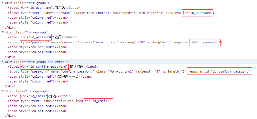 # 书写针对用户表的forms组件代码 from django import forms class MyRegForm(forms.Form): username = forms.CharField(label='用户名', min_length=3, max_length=8, error_messages={ 'required': '用户名不能为空', 'min_length': '用户名最少3位', 'max_length': '用户名最多8位' }, # 还要让标签有bootstrap样式 widget=forms.widgets.TextInput(attrs={'class': 'form-control'}) ) password = forms.CharField(label='密码', min_length=3, max_length=8, error_messages={ 'required': '密码不能为空', 'min_length': '密码最少3位', 'max_length': '密码最多5位' }, # 还要让标签有bootstrap样式 widget=forms.widgets.PasswordInput(attrs={'class': 'form-control'}) ) confirm_password = forms.CharField(label='确认密码', min_length=3, max_length=8, error_messages={ 'required': '密码不能为空', 'min_length': '密码最少3位', 'max_length': '密码最多8位' }, # 还要让标签有bootstrap样式 widget=forms.widgets.PasswordInput(attrs={'class': 'form-control'}) ) email = forms.CharField(label='邮箱', error_messages={ 'required': '邮箱不能为空', 'invalid': '邮箱格式不正确' }, ) # 局部钩子 def clean_username(self): # 获取到用户名 username = self.cleaned_data.get('username') # 数据通过了form组件条件的数据都会存储在cleaned_data里,所以我们拿出这里面(过了第一道关卡)的数据,进行添加第二道关卡 if 'yuan' in username: # 提示前端展示错误信息 self.add_error('username', '用户名不能存在yuan') # 将钩子函数勾出来的数据再放回去 return username # 全局钩子 def clean(self): password = self.cleaned_data.get('password') confirm_password = self.cleaned_data.get('confirm_password') if not password == confirm_password: self.add_error('confirm_password', '两次密码不一致') return self.cleaned_data