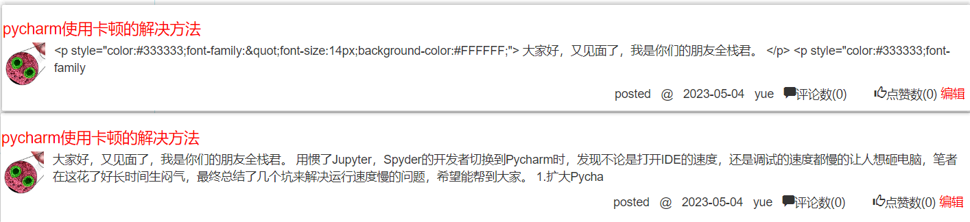 # 两个需要注意的问题 1.文章的简介 不能直接切去,应该先获取到当前页面的文本内容之后截取150个文本字符 2.xss攻击 用户直接编写html代码的网站,针对用户直接书写script标签 1.注释标签内部的内容 2.直接将script删除 # 如何解决 # 自己书写代码解决 针对问题一:后端通过正则表达式筛选 针对问题二:需要获取script标签 # 通过对应的模块来解决 beautifulsoup模块(又称bs4模块) 专门用来处理html页面的内容(该模块主要用于爬虫程序) pip3 install beautifulsoup4 # 模块使用 soup = BeautifulSoup(content,'html.parser') tags = soup.find_all() # 获取所有的标签 for tag in tags: # print(tag.name) # 获取页面所有的标签 # 针对script标签 直接删除 if tag.name == 'script': # 删除标签 tag.decompose() # 文章简介 # 1 先简单暴力的直接切去content 150个字符 # desc = content[0:150] # 2 截取文本150个 desc = soup.text[0:150] """ 当你发现一个数据处理起来不是很方便的时候 可以考虑百度搜搜有没有现成的模块帮你完成相应的功能 """