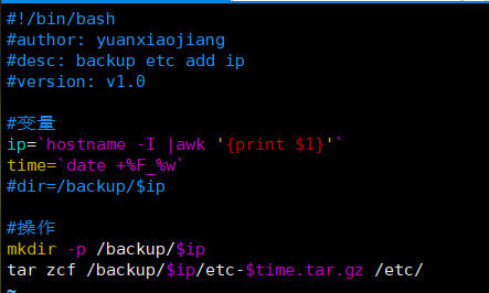 [root@yuan ~]# cat /my_server/scripts/backup-etc.sh #!/bin/bash time=`date +%F_%w_%H` tar zcf /backup/etc-$time.tar.gz /etc/