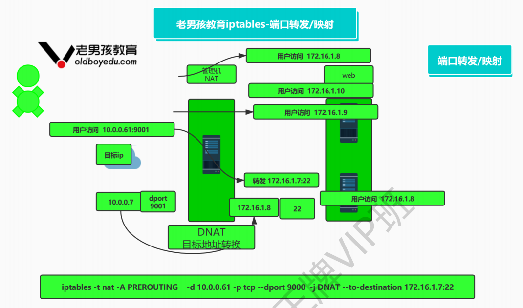 [root@m01 ~]# iptables -t nat -A PREROUTING -d 10.0.0.61 -p tcp --dport 9000 -j DNAT --to-destination 172.16.1.7:22 [root@m01 ~]# iptables -nL -t nat Chain PREROUTING (policy ACCEPT) target prot opt source destination DNAT tcp -- 0.0.0.0/0 10.0.0.61 tcp dpt:9000 to:172.16.1.7:22 Chain POSTROUTING (policy ACCEPT) target prot opt source destination SNAT all -- 172.16.1.0/24 0.0.0.0/0 to:10.0.0.61