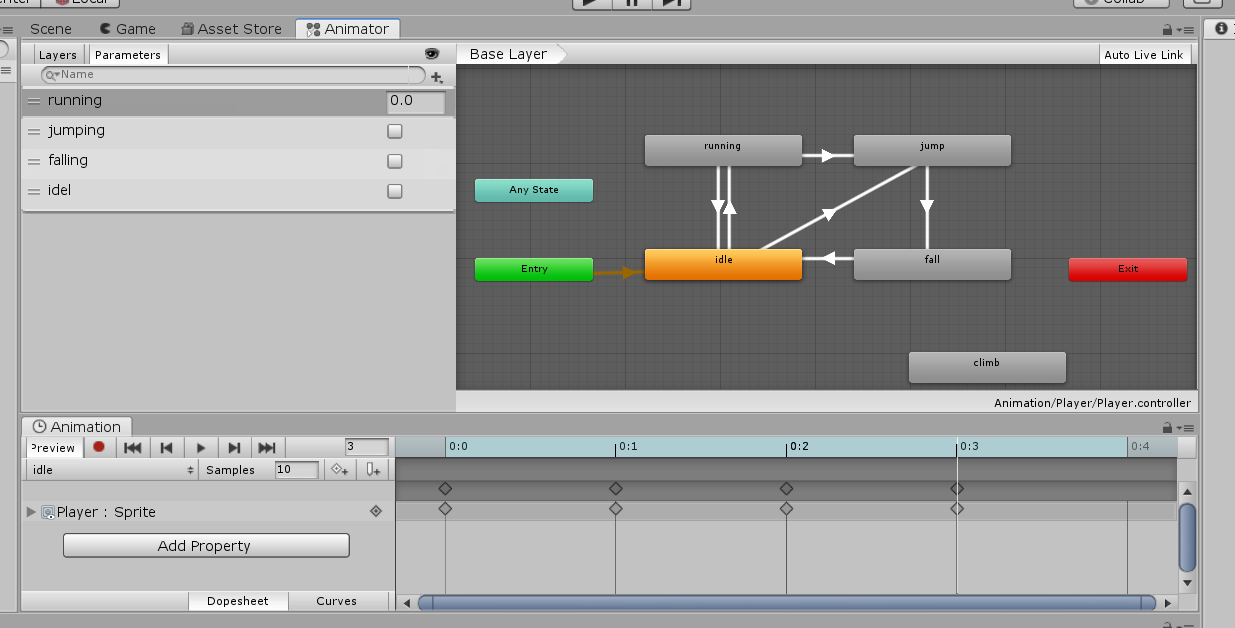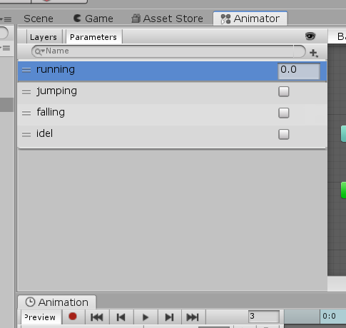 这里将跑动判定设为浮点型(即速度大于0.1时就算为跑动)其他三个判定设为bool类型