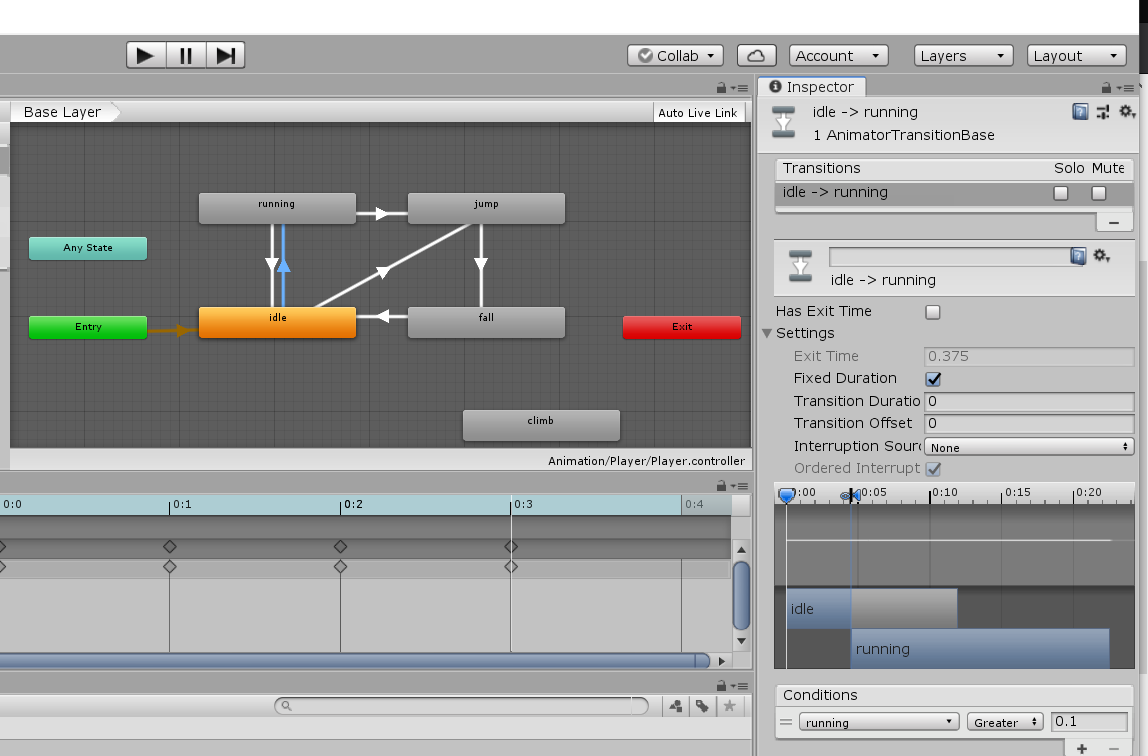 比如我上面的图片中所展示的,跑动和站立可以来回切换,并且跑动和站立时都可以跳跃,但跳跃后只能下落并且恢复到站立的姿态