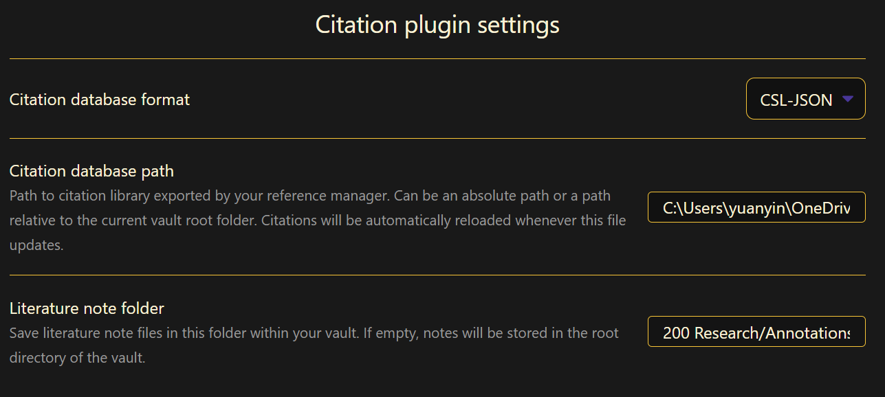 然后在Obsidian安装Citations插件,在插件设置中设置对应的文件路径,Citation database path 是 My Zotero Library.json 的路径名,然后 Literature note folder 是自动存放在 Obsidian Vault 的位置。