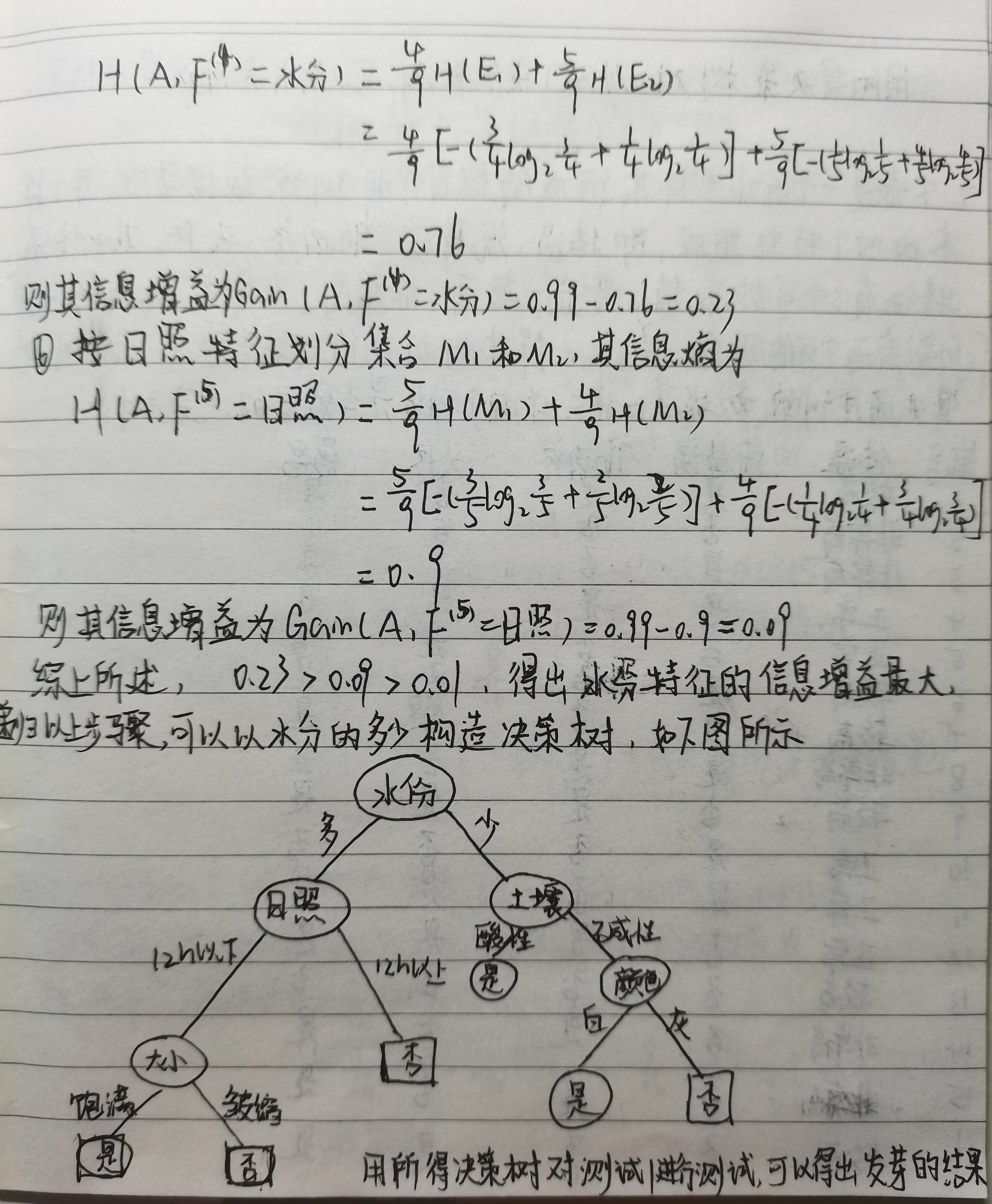 表1所示的数据集表示豌豆种子在不同环境下能否发芽情况。豌豆种子自身有形状、大小和种皮颜色等特征,外部影响环境有土壤、水分和日照等特征。试通过所示数据集构建ID3决策树并根据最后一行测试数据预测该豌豆能否发芽。