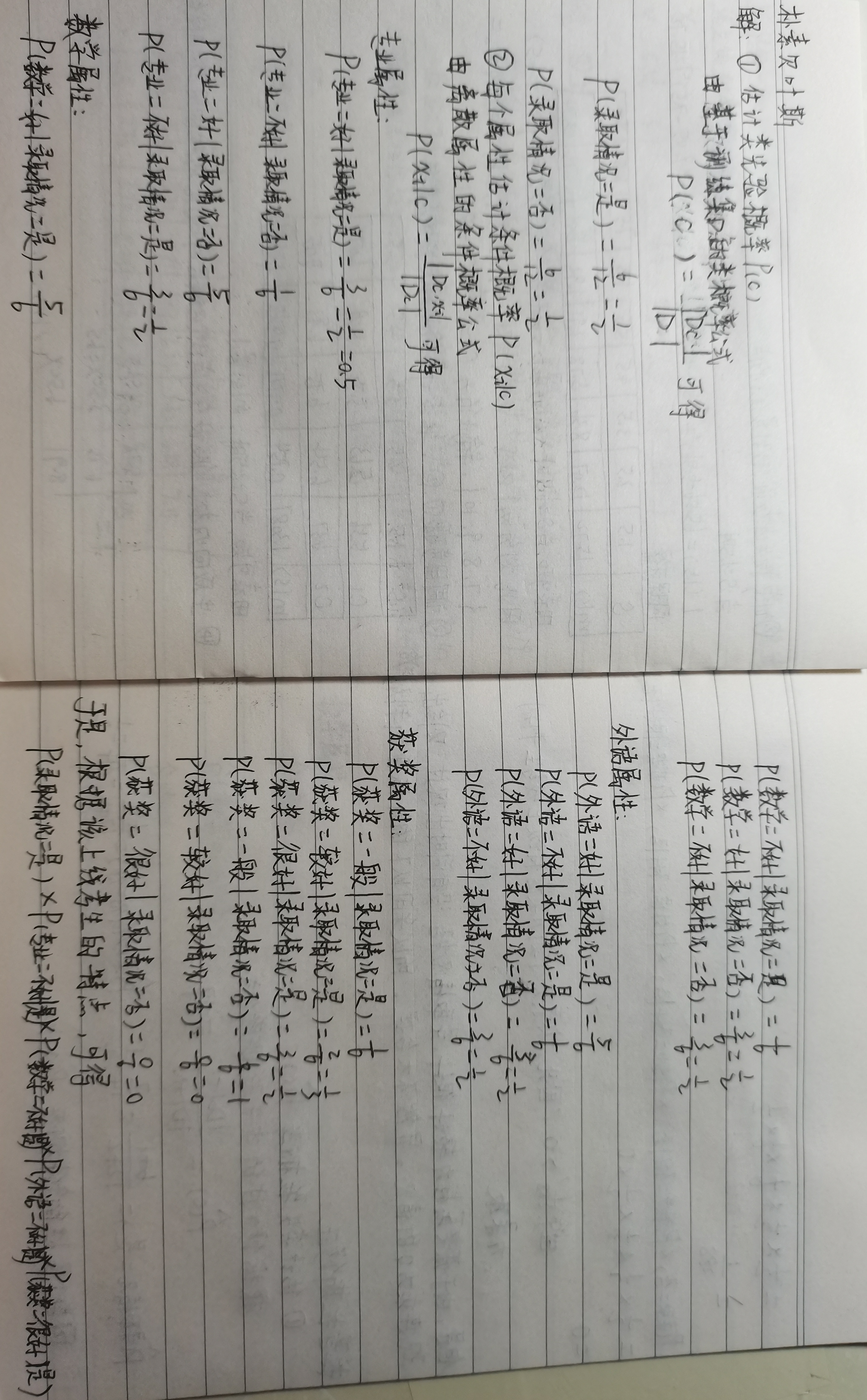 1.下表中是某大学一位研究生导师带过的硕士研究生录取情况表,根据该表建立朴素贝叶斯模型,现有一名上线考生想报考该导师,考生的特点是专业、数学和外语都不好,获奖情况很好,请你判断该生能否被录取。