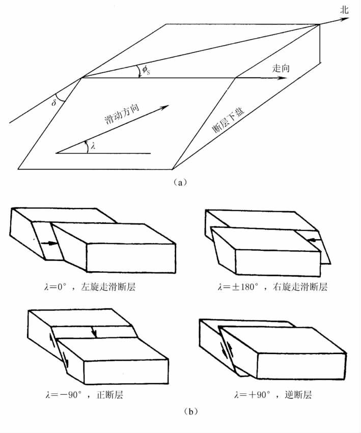 例如:λ≈0°:表示左旋走滑断层,断层水平错动,人在断层任一侧面对断层, 另一侧向左。λ ≈±180° :表示右旋走滑断层(断层水平错动,人在断层任一侧面对断层,另一侧向右)。