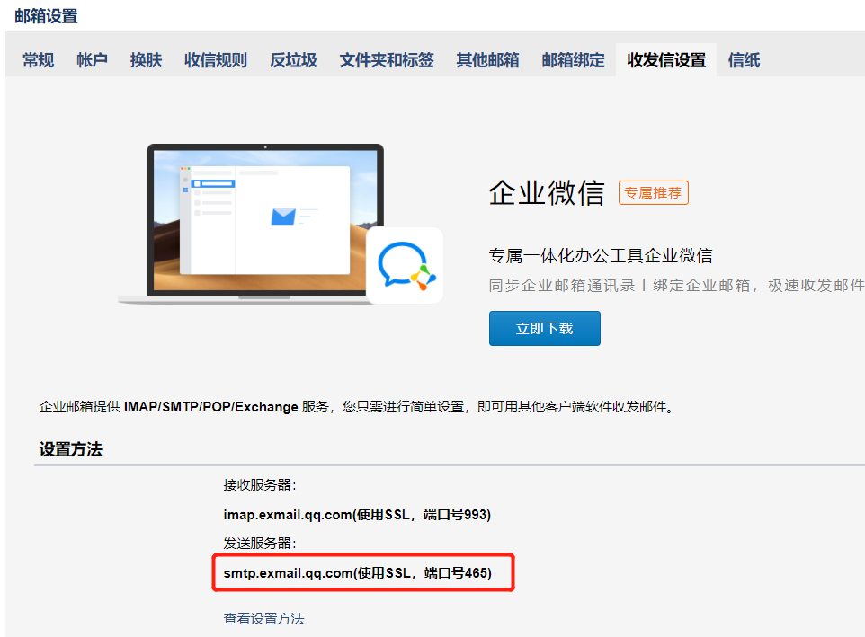 ①腾讯企业邮箱的服务器以及端口配置,在官网的“收发信设置”里可以查看