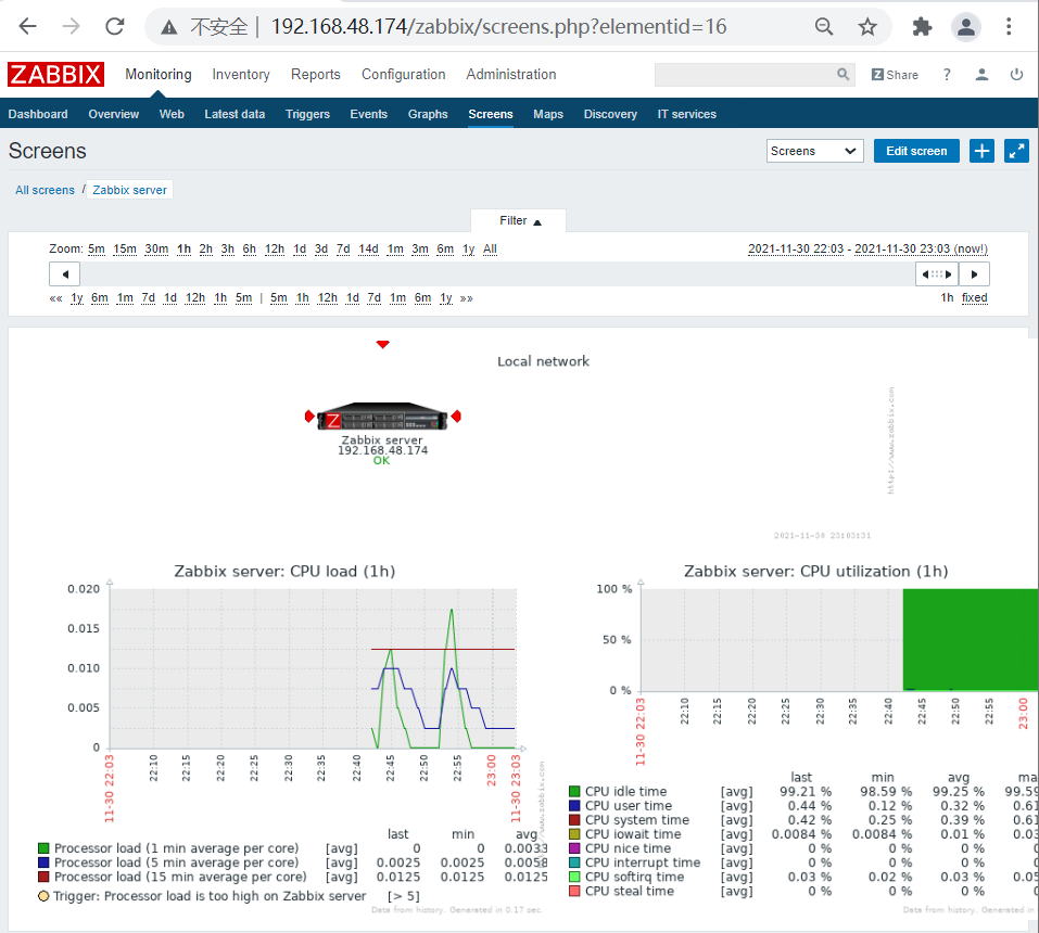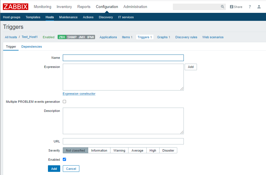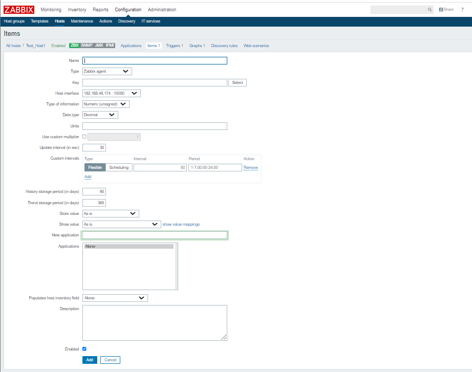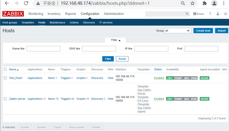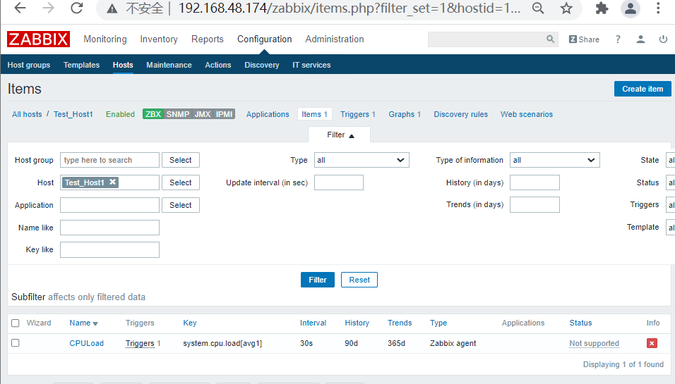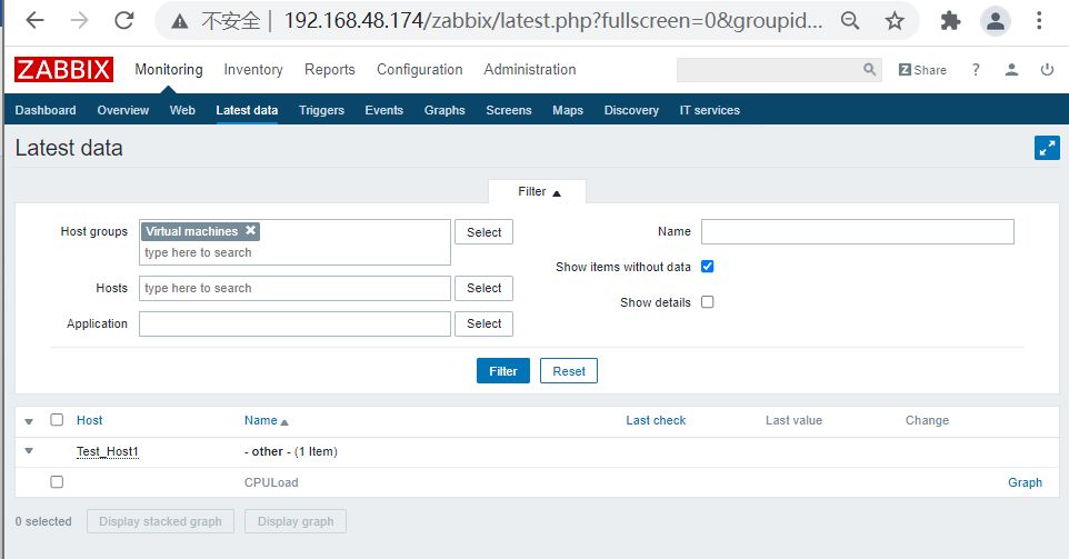 (四)、添加host 1、配置: Host name:Test_Host1 Groups In groups:Virtual machines IP address:192.168.48.174 Port:10050