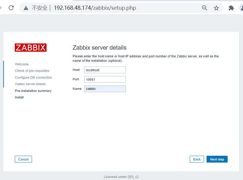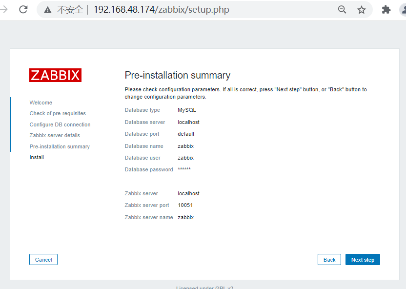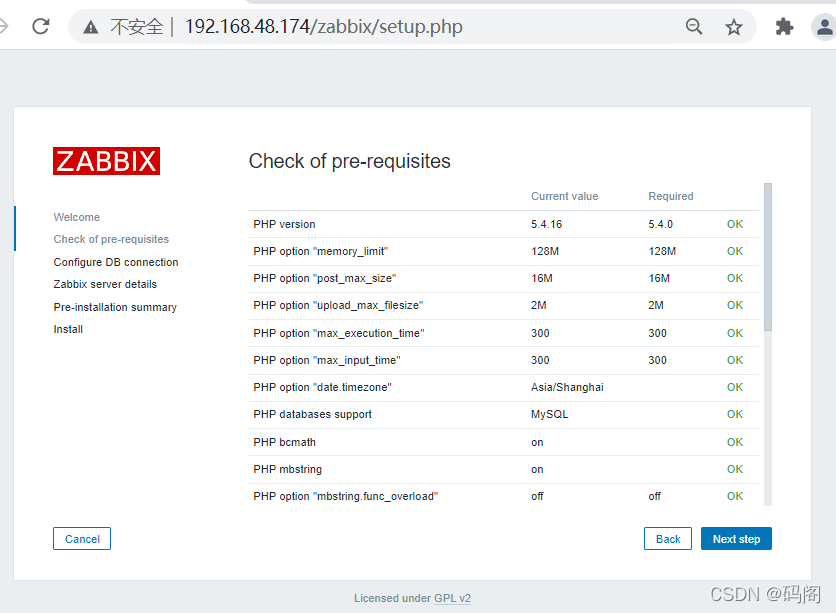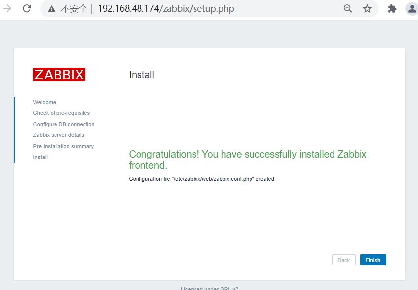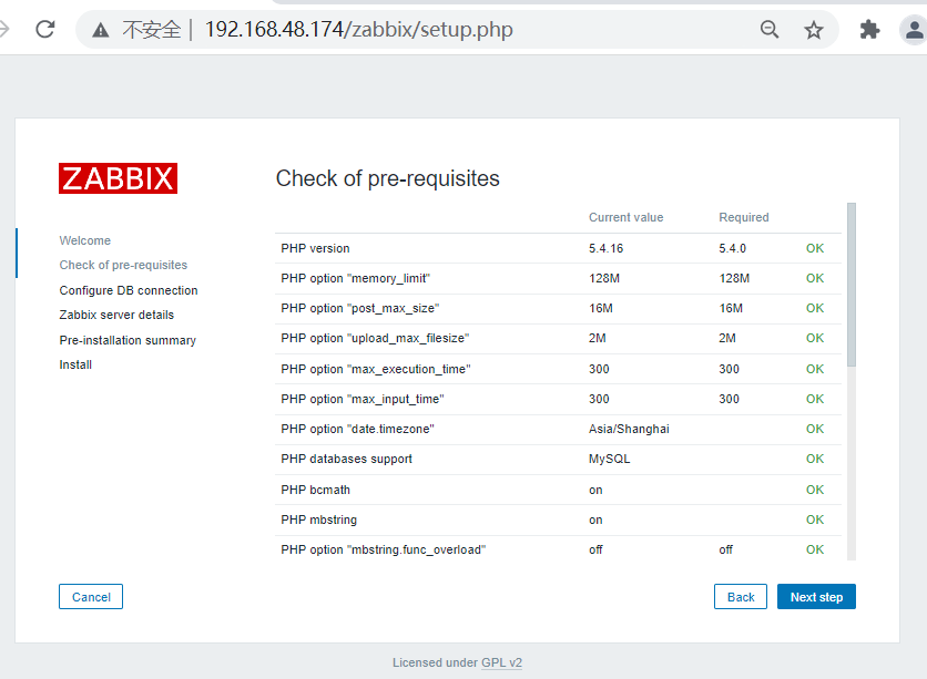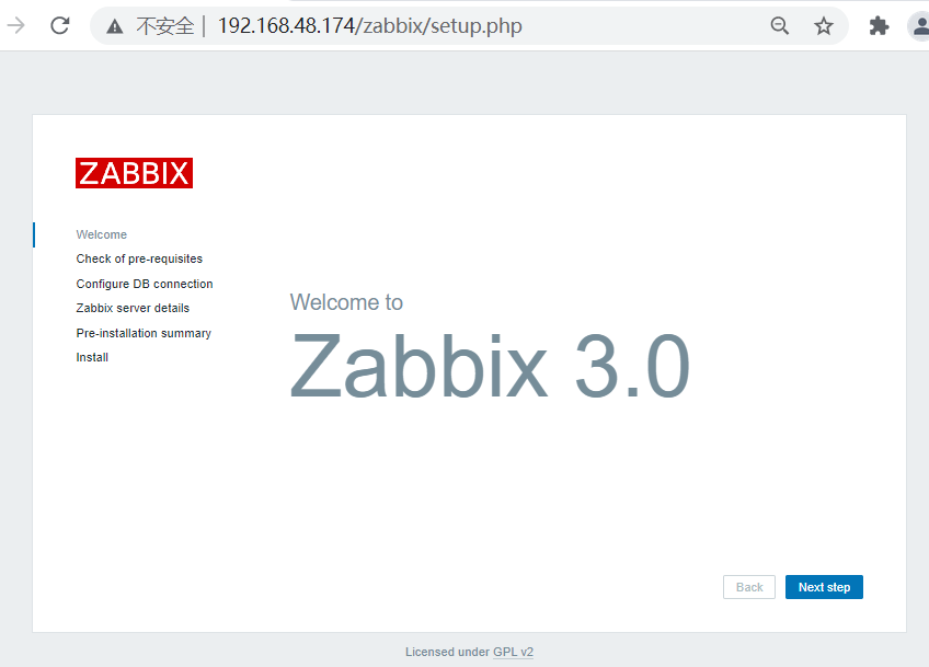 (二)、server端安装配置 1、软件包安装 [root@localhost~]#rpm -ivh http://repo.zabbix.com/zabbix/3.0/rhel/7/x86_64/zabbix-release-3.0-1.el7.noarch.rpm [root@localhost ~]# yum -y install zabbix-server-mysql zabbix-web-mysql zabbix-get 2、配置数据库 [root@localhost ~]# cd /usr/share/doc/zabbix-server-mysql-3.0.32/ [root@localhost zabbix-server-mysql-3.0.32]# zcat create.sql.gz | mysql -uroot -p123456 zabbix [root@localhost ~]# cd /etc/zabbix [root@localhost zabbix]# vim zabbix_server.conf DBHost=localhost DBname=zabbix DBUser=zabbix DBpassword=itcast [root@localhost ~]# cd /etc/httpd/conf.d/ [root@localhost conf.d]# vim zabbix.conf php_value data.timezone Asia/Shanghai [root@localhost conf.d]# systemctl start zabbix-server [root@localhost conf.d]# systemctl enable zabbix-server 3、zabbix访问 启动: [root@localhost conf.d]# systemctl restart httpd
