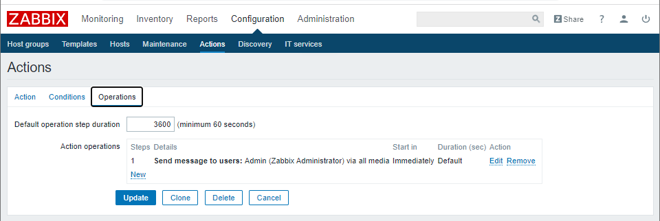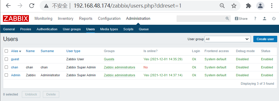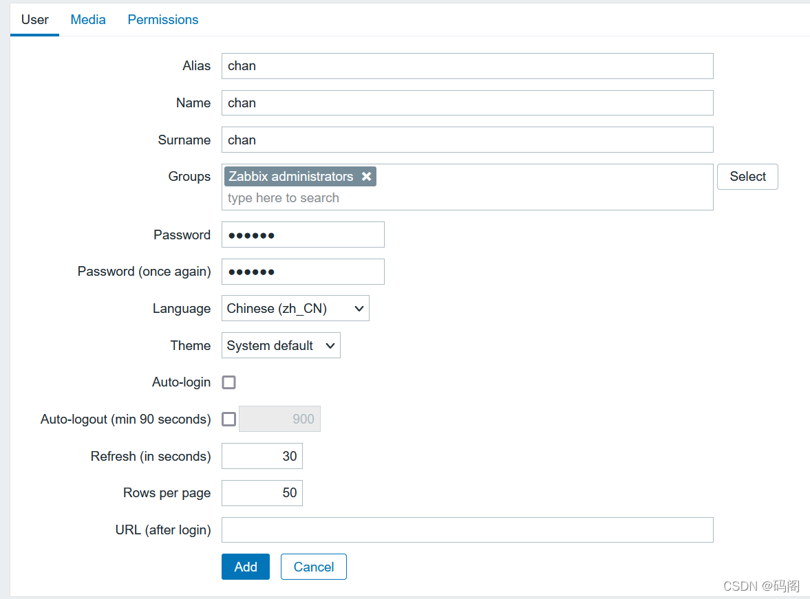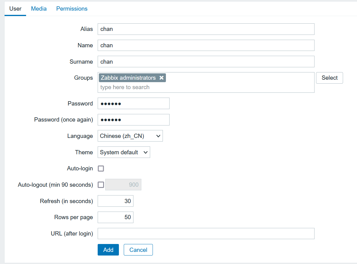 (三)、创建zabbix用户 1、配置: Alias:chan。 Name:chan。 Surname:chan Group:Zabbix administrations。 Media:root@localhost.localdmi。 Permissions:ZabbixSuper Admin。
