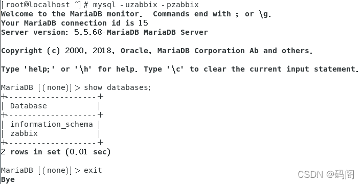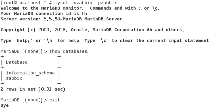[root@localhost ~]# mysql -uroot -p123456 -e "grant all on zabbix. * to 'zabbix'@'%' identified by 'zabbix';" [root@localhost ~]# mysql -uzabbix -pzabbix