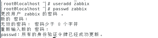 5、创建zabbix数据库及用户 [root@localhost ~]# mysql -uroot -p123456 -e "create database zabbix default character set utf8 collate utf8_bin;" [root@localhost ~]# useradd zabbix [root@localhost ~]# passwd zabbix