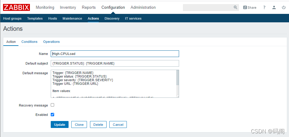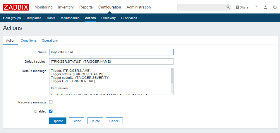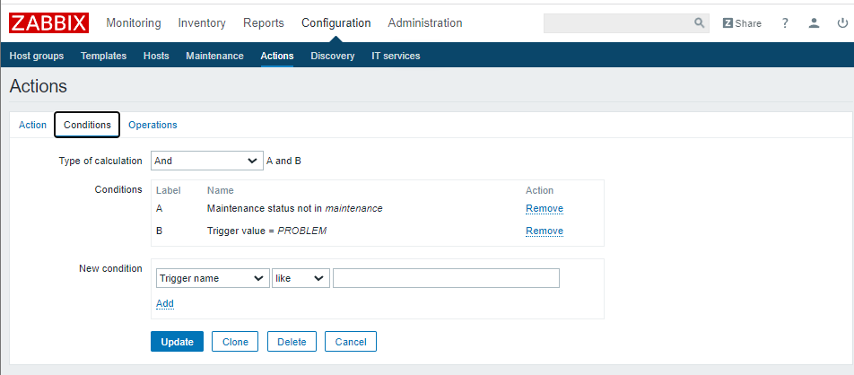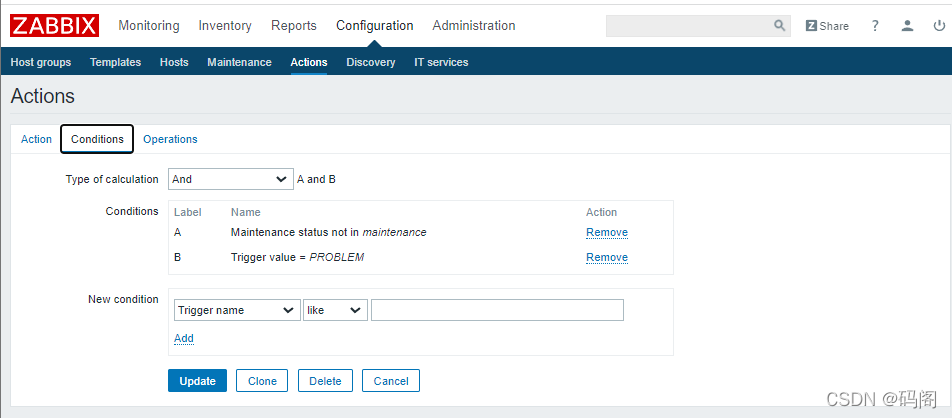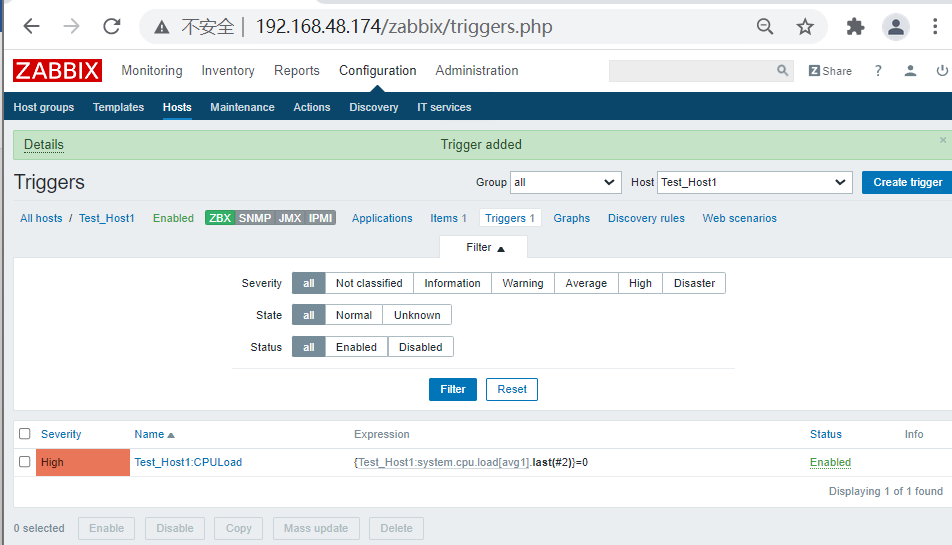 (六)、创建Trigger 1、配置信息如下: Item:Test_Host1:CPULoad Function:Last(most recent)T value is = N N:2