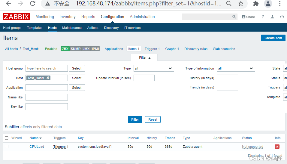 (五)、配置Item 1、配置 Name:CPULoad Type:Zabbix agent Key:system.cpu.load[avg1] Host interface:192.168.48.174:10050 Type of information:Numeric(float)