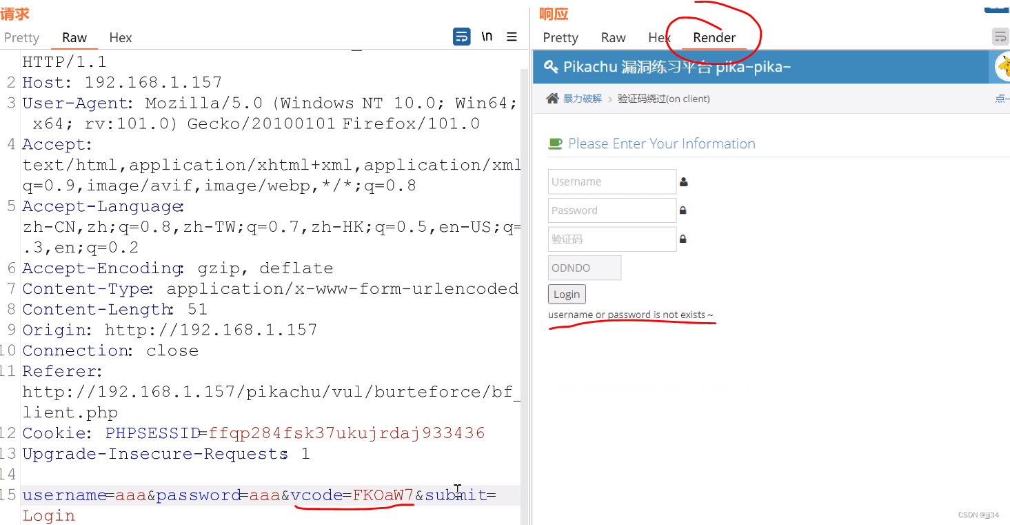 通过查看源代码发现验证码是前端验证码,可以直接抓包的方式在bp里爆破,参考pikaqiu-bf_client.php