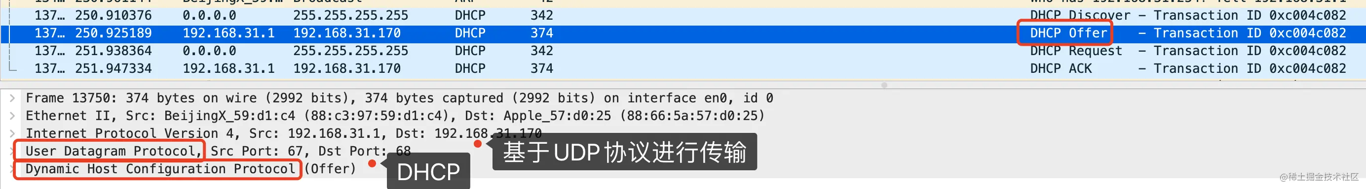 另外,通过抓包,我们可以发现DHCP是应用层的协议,基于传输层UDP协议进行数据传输。