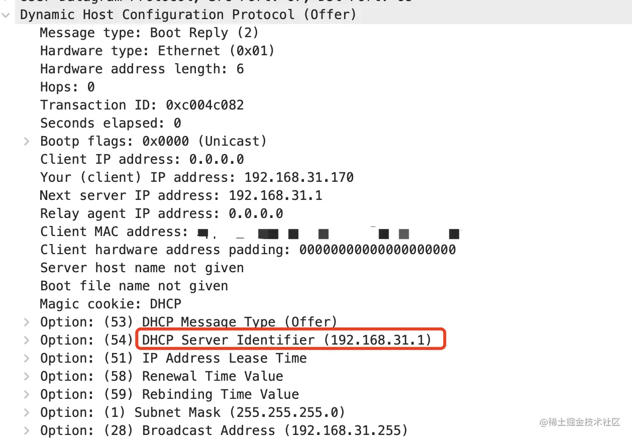 最后给大家留个问题吧。我们上面的IP都是从DHCP服务器上申请的,在服务器返回DHCP Offer的时候,可以看到上面写了DHCP服务器的IP。比如192.168.31.1,这明显是个局域网内的IP,但这能说明,你的DHCP服务器一定在这个局域网里吗?