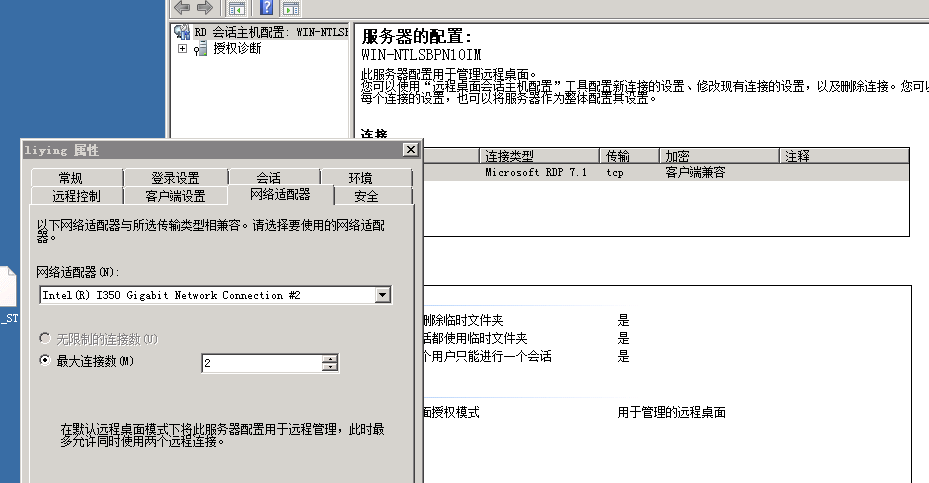 就是没有192.168.10.230这个网卡的,控制面板 – 管理工具 – 远程桌面会话主机配置 确实有RDP的连接,就算为这个连接指定192.168.10.230这个网卡还是不行。后来咨询了一下,这台服务器的系统是硬件供应商装的!!我用原版镜像装的那两台什么事都没有哦,估计是贪方便乱来了。