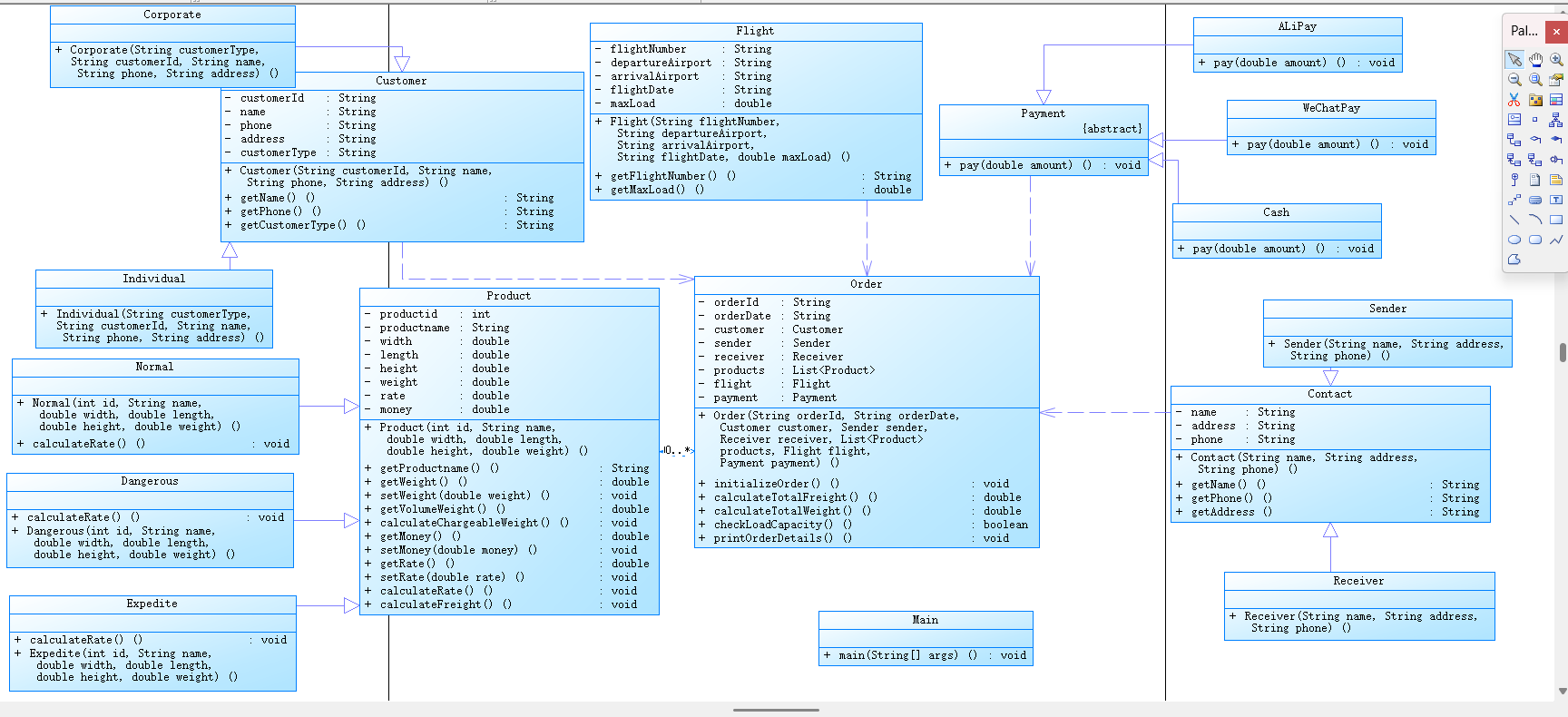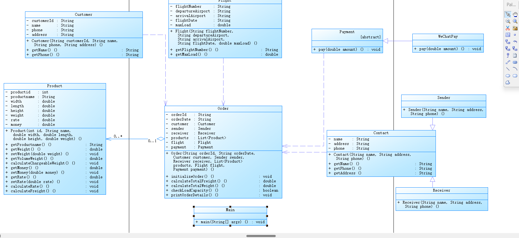 从输入的数据中可以找到类的设计,首先是Customer类,Flight类,Payment类,WeChatPay类作为Payment类的子类,Product类,Order类,然后,由于Sender,Receiver两个类过于相似,我就设计了一个他们的父类Contact,当然,其实不需要这样设计,现在想想反而更复杂,也不符合多态与继承的设计。