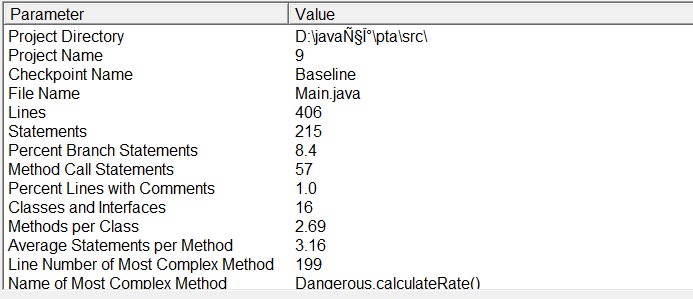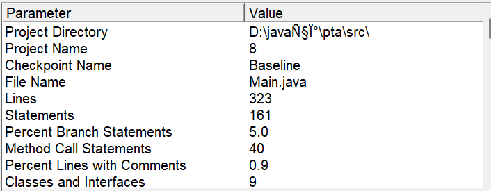 主文件为 “Main.java”,代码总行数 323 行,语句总数 161 条,分支语句占比 5.0%,方法调用语句 40 条,含注释的行占比极低,仅 0.9%,类和接口共 9 个。由此可见,代码规模较为常规,但注释稀缺,对代码的可读性与后期维护埋下隐忧。好的注释能够方便下一次的阅读,然而我的注释较为稀少,可能对我自己当前的阅读没有影响,然而对以后的阅读以及修改可能造成不方便,因此要添加更多的注释。