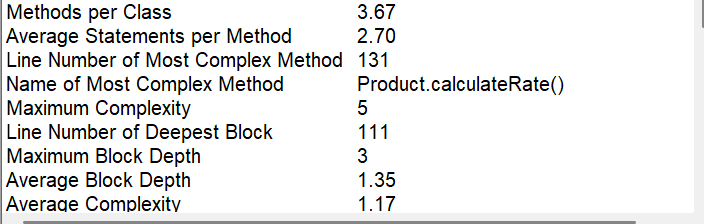 第二组表格呈现代码的复杂度与方法分布。平均每个类的方法数为 3.67 个,每个方法平均语句数 2.70 条。其中,Product.calculateRate() 方法最为复杂,行数达 131 行,最大复杂度为 5,最深代码块行数 111 行,最大代码块深度 3,平均代码块深度 1.35,平均复杂度 1.17。这表明整体代码复杂度尚可,但存在个别较复杂的方法,可进一步探究其逻辑细节与优化空间。