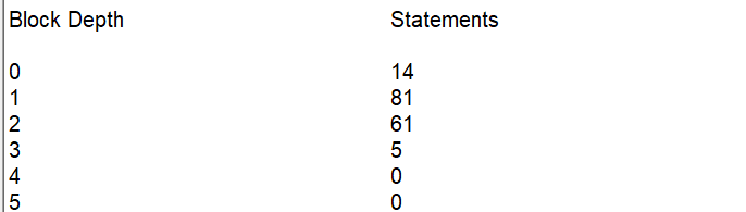 最大和平均代码块深度:最大深度 3 ,平均深度 1.35 ,说明代码的嵌套层次较浅,代码结构比较扁平,这对于代码阅读和理解非常友好,降低了逻辑的嵌套难度。