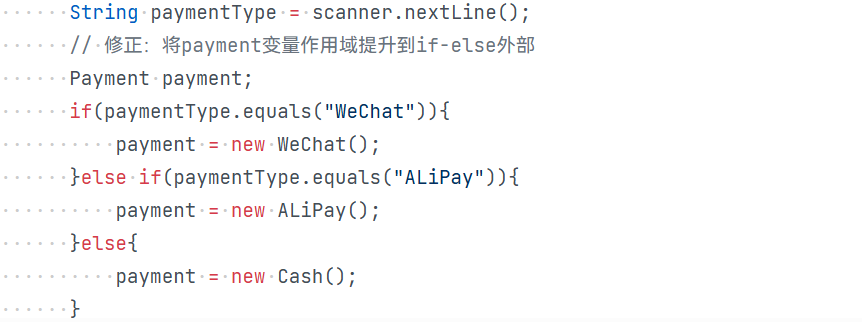 AliPay、WeChatPay、Cash:Payment的子类,分别实现具体的支付方式,重写pay方法。