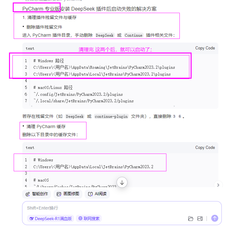 pycharm专业版,安装了deepseek后,报错,不能启动了;安全模式也启动不了,依旧报错;(已解决,手动删除安装的deepseek相关插件)