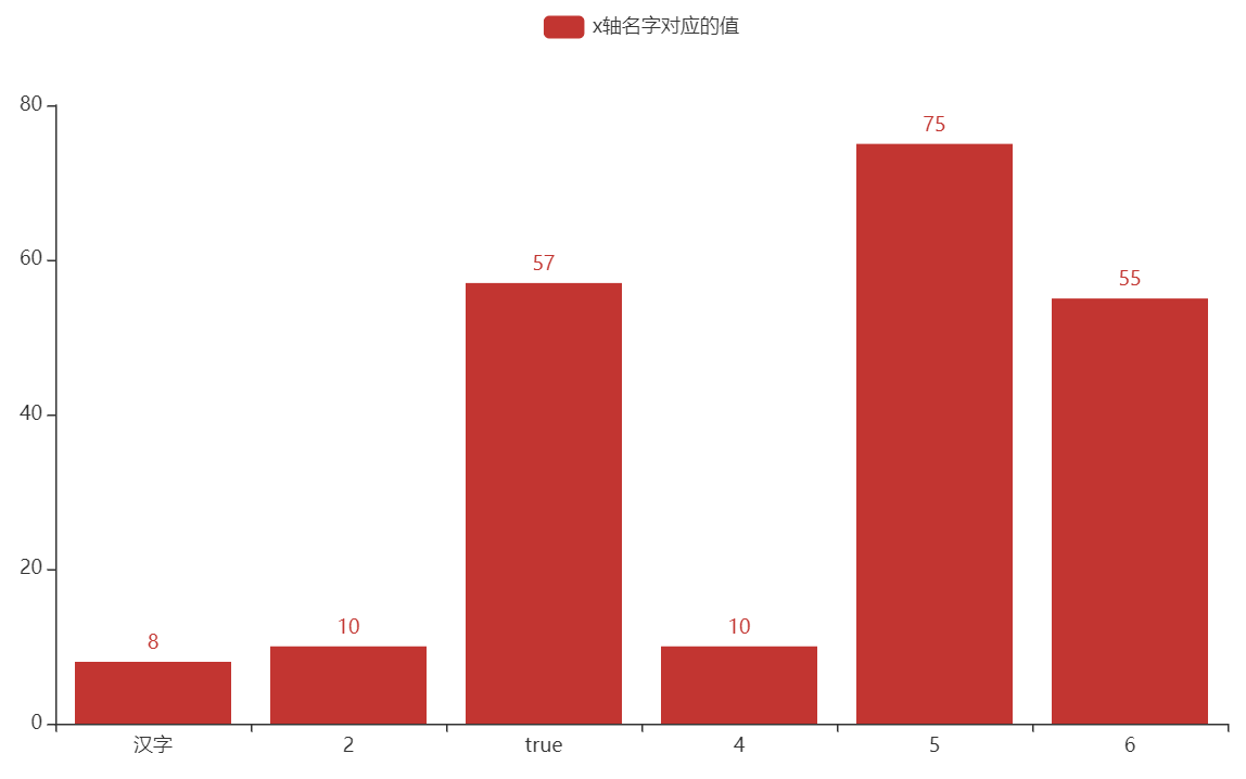 bar = Bar() # 添加x轴(横轴)的一系列名字,类型能有以下 bar.add_xaxis(['汉字',2,True,4,5,6]) # 添加y轴的名字,和对应的值,默认为0 bar.add_yaxis("x轴名字对应的值", [8, 10, 57, 10, 75,55]) # render 会生成本地 HTML 文件,默认会在当前目录生成 render.html 文件 # 也可以传入路径参数,如 bar.render("mycharts.html") bar.render()