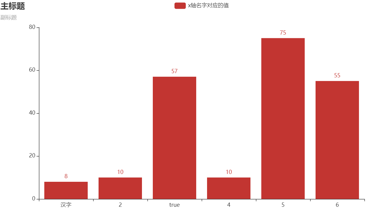 # 导入条形图 from pyecharts.charts import Bar # 导入配置,并作为。。 from pyecharts import options as opts # V1 版本开始支持链式调用 # 你所看到的格式其实是 `black` 格式化以后的效果 # 可以执行 `pip install black` 下载使用 bar = ( Bar() .add_xaxis(['汉字',2,True,4,5,6]) .add_yaxis("x轴名字对应的值", [8, 10, 57, 10, 75,55]) # 配置 .set_global_opts(title_opts=opts.TitleOpts(title="主标题", subtitle="副标题")) # 或者直接使用字典参数 # .set_global_opts(title_opts={"text": "主标题", "subtext": "副标题"}) ) bar.render() # 不习惯链式调用的开发者依旧可以单独调用方法 bar = Bar() bar.add_xaxis(['汉字',2,True,4,5,6]) bar.add_yaxis("x轴名字对应的值", [8, 10, 57, 10, 75,55]) bar.set_global_opts(title_opts=opts.TitleOpts(title="主标题", subtitle="副标题")) bar.render()