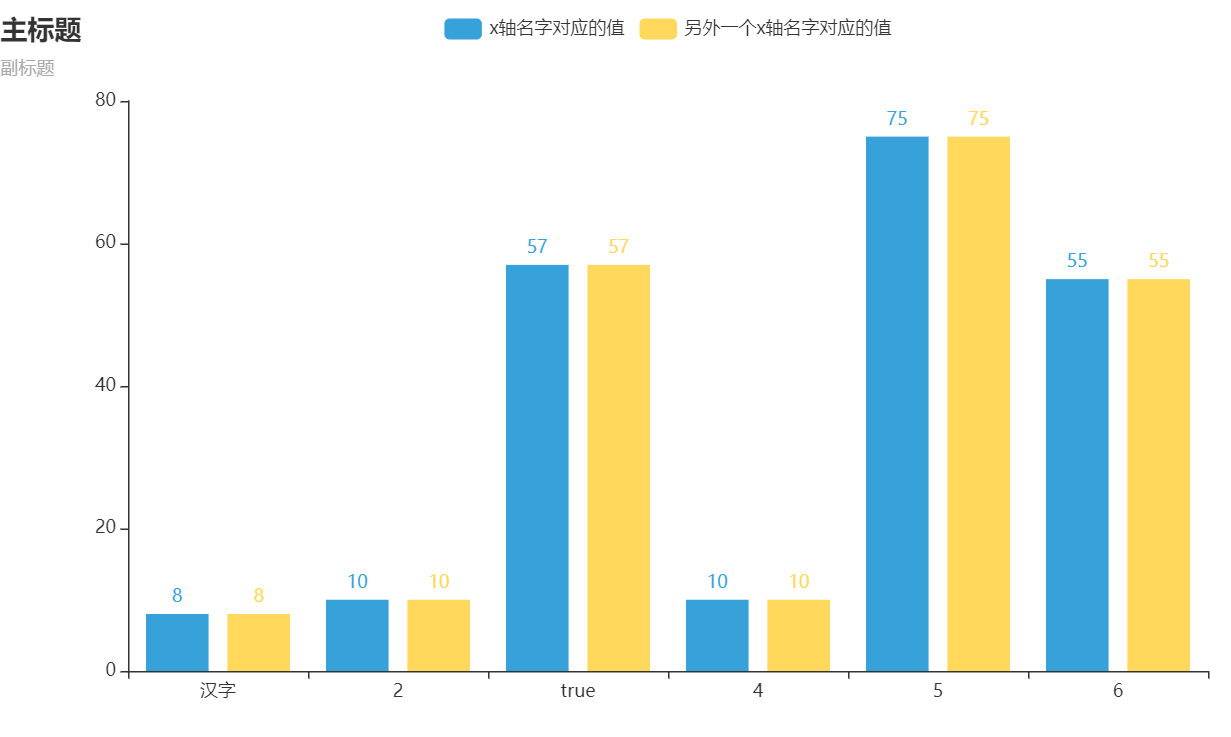 from pyecharts.charts import Bar from pyecharts import options as opts # 内置主题类型可查看 pyecharts.globals.ThemeType from pyecharts.globals import ThemeType bar = ( # 会变色,不一样 Bar(init_opts=opts.InitOpts(theme=ThemeType.LIGHT)) .add_xaxis(['汉字',2,True,4,5,6]) .add_yaxis("x轴名字对应的值", [8, 10, 57, 10, 75,55]) .add_yaxis("另外一个x轴名字对应的值", [8, 10, 57, 10, 75,55]) .set_global_opts(title_opts=opts.TitleOpts(title="主标题", subtitle="副标题")) ) bar.render()