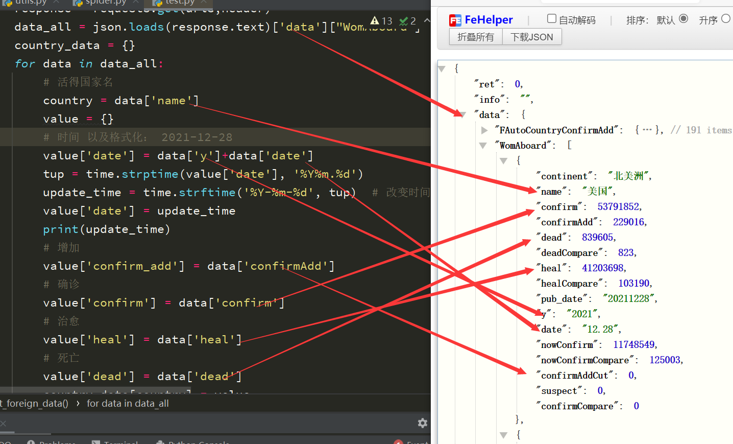 # 返回数据格式:国名 : {'date': '2021-12-28', 'confirm_add': 229016, 'confirm': 53791852, 'heal': 41203698, 'dead': 839605} def get_foreign_data(): start_time = time.time() urls = 'https://api.inews.qq.com/newsqa/v1/automation/modules/list?modules=FAutoCountryConfirmAdd,WomWorld,WomAboard' header = { "user-agent": "Mozilla/5.0 (Windows NT 10.0; Win64; x64) AppleWebKit/537.36 (KHTML, like Gecko) Chrome/80.0.3987.122 Safari/537.36" } # value 格式{'date': '2021-02-01', 'confirm_add': 0, 'confirm': 2, 'heal': 0, 'dead': 0} response = requests.get(urls,header) data_all = json.loads(response.text)['data']["WomAboard"] country_data = {} for data in data_all: # 活得国家名 country = data['name'] value = {} # 时间 以及格式化: 2021-12-28 value['date'] = data['y']+data['date'] tup = time.strptime(value['date'], '%Y%m.%d') update_time = time.strftime('%Y-%m-%d', tup) # 改变时间格式,不然插入数据库会报错 value['date'] = update_time print(update_time) # 增加 value['confirm_add'] = data['confirmAdd'] # 确诊 value['confirm'] = data['confirm'] # 治愈 value['heal'] = data['heal'] # 死亡 value['dead'] = data['dead'] country_data[country] = value print("各国数据请求完毕:", time.time() - start_time, '秒') return country_data