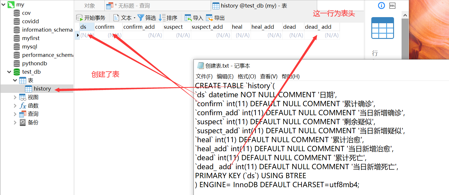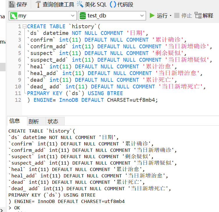 CREATE TABLE `history`( `ds` datetime NOT NULL COMMENT '日期', `confirm` int(11) DEFAULT NULL COMMENT '累计确诊', `confirm_add` int(11) DEFAULT NULL COMMENT '当日新增确诊', `suspect` int(11) DEFAULT NULL COMMENT '剩余疑似', `suspect_add` int(11) DEFAULT NULL COMMENT '当日新增疑似', `heal` int(11) DEFAULT NULL COMMENT '累计治愈', `heal_add` int(11) DEFAULT NULL COMMENT '当日新增治愈', `dead` int(11) DEFAULT NULL COMMENT '累计死亡', `dead_ add` int(11) DEFAULT NULL COMMENT '当日新增死亡', PRIMARY KEY (`ds`) USING BTREE ) ENGINE= InnoDB DEFAULT CHARSET=utf8mb4;